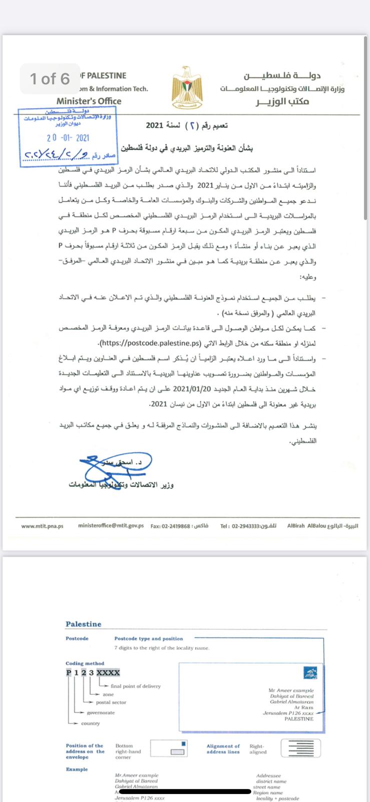 وزارة الاتصالات وتكنولوجيا المعلومات تصدر تعميماً بشأن العنونة والترميز البريدي في فلسطين .